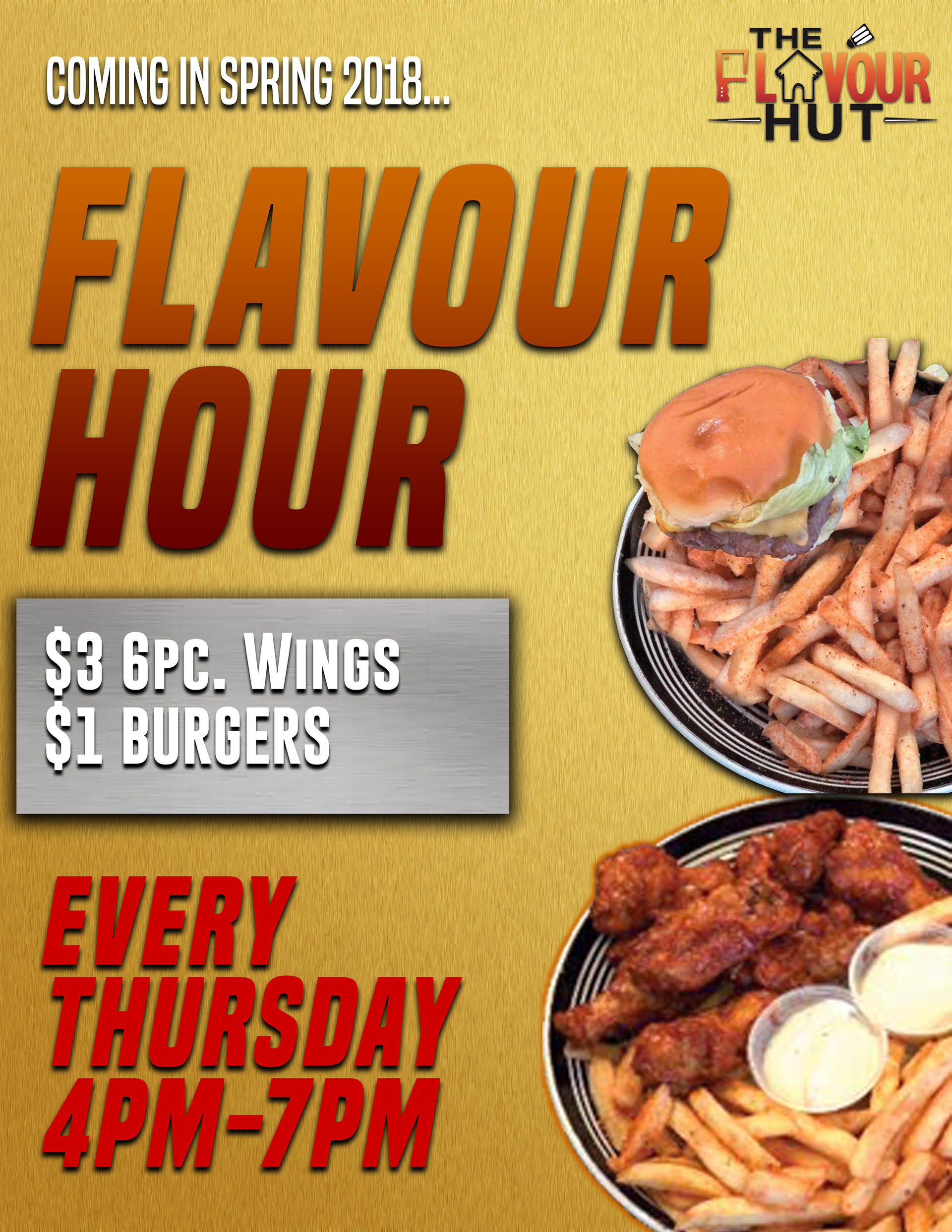 A flyer used to promote a Happy Hour style promotion for the Flavour Hut, a small family owned restaurant in Norfolk, Va. The flyer was advertised heavily across the restaurant's Twitter and Instagram pages.